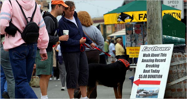 Mr. Bethune remains optimistic and says he sees positive signs everywhere. The project’s Web site, www.earthrace.net, has been getting about 20,000 hits a day, he said, compared with about 2,000 a day before the boat left New Zealand. And on a good day, the Earthrace has reaped up to $4,000 from curious onlookers.